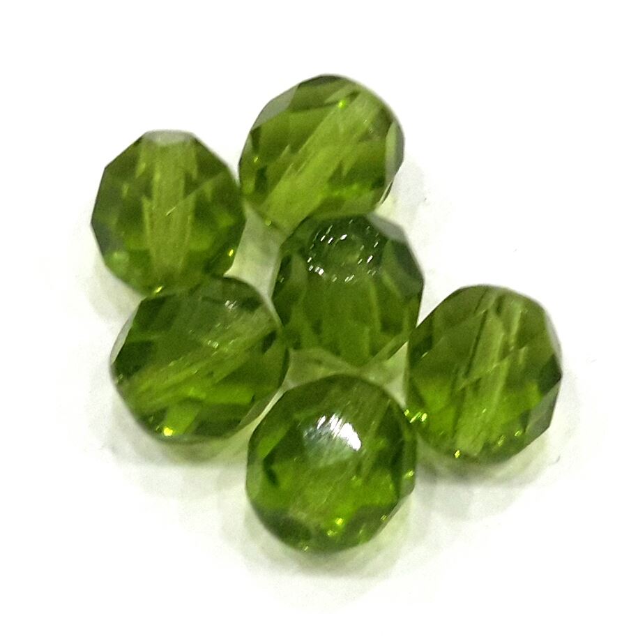 Bola de cristal checo facetada o con caras de color olivine, tiene un tamaño de 4 mms, tiene un pase de 1 mm aprox, abalorio ideal para la fabricación de complementos o el adorno de ropa, alta calidad.